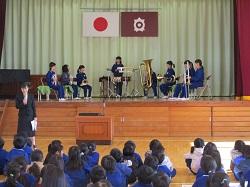 朝会では、各種表彰を行った後、昨日アンサンブルコンテストに出場した金管バンド部員が全校生の前で演奏を披露しました。和と洋の融合をテーマにした、素晴らしい演奏でした。