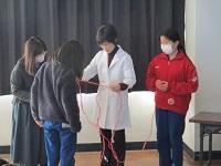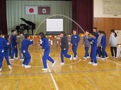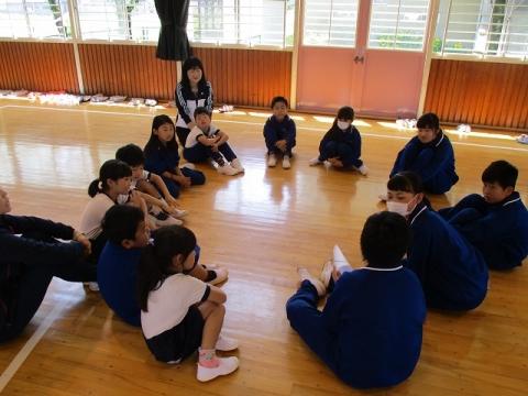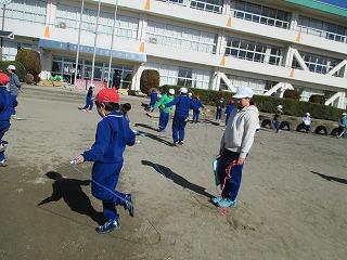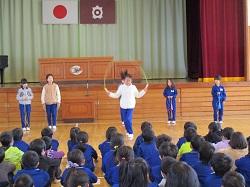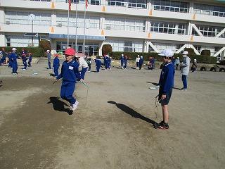運動集会では、全校生でなわとびに取り組んでいます。上級生が下級生に跳び方の種類や、コツを