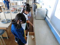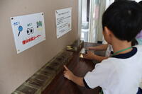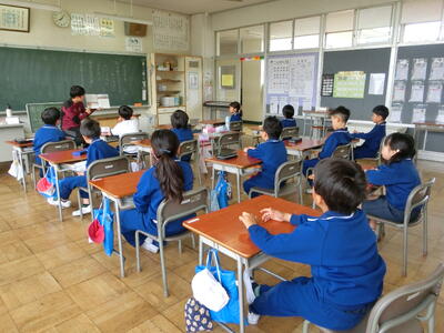 また、1年生は2時間目にくつ箱の使い方の勉強をしました。お話をよく聞いて、すばやく行動してくれました。