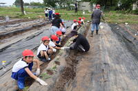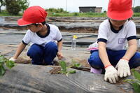 サツマイモの苗は、斜めに植えることに注意して植え、土をかぶせました。