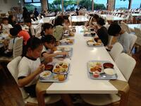 夕食後にナイトハイクの予定でしたが、気温が低かったので、海の展示室で海の生き物や自然について学習しました。子どもたちはそろそろ寝る準備に入ります。夕ご飯もバイキングでおいしく食べられました。