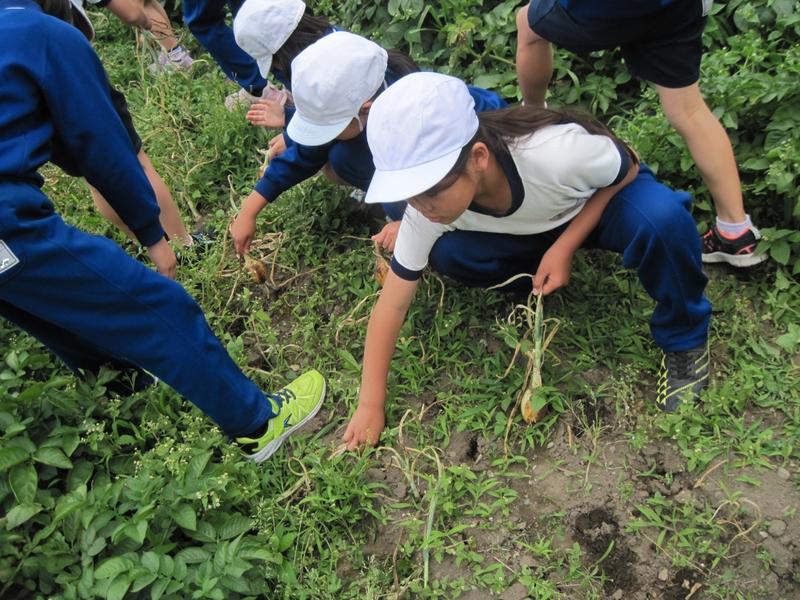 クリーン活動で草むしりを全校生徒で行った後、1・2・3年生でじゃがいもほりをしました。土の中に埋まっているじゃがいもを見つけたときには、お宝を見つけたように子どもたちは、はしゃいでいました。