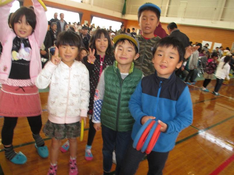 三世代の皆さんが集まり地区ごとにチームをつくり、輪投げ、二人三脚・パン食い競走・グランドゴルフを行いました。中学生も時間をつくって参加してくれました。
