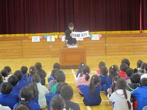はっぴー集会では、虫歯がなく、歯の状態がとても良い児童が名前を呼ばれ、全校生徒に紹介されました。その後、健康委員会によるクイズ大会が行われ、楽しみながら、歯に関する知識を学ぶことができました。