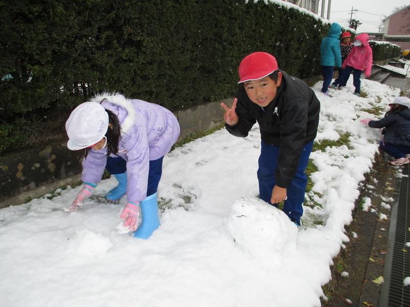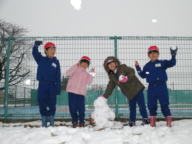 初雪に大喜び。業間や昼休みに、雪だるまをつくったり雪合戦をしたりして遊びました。