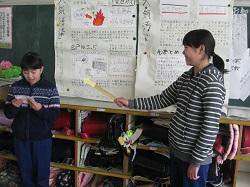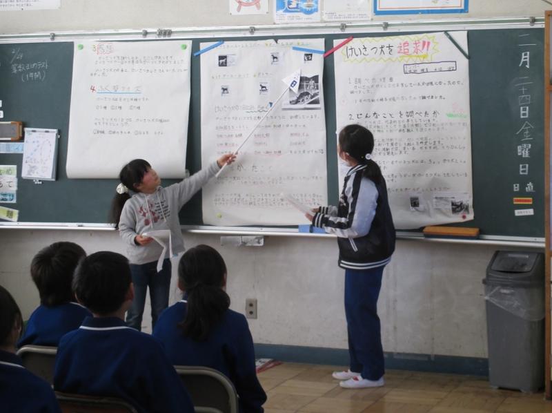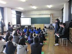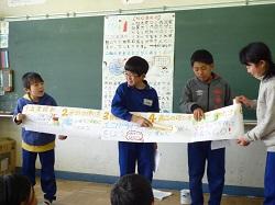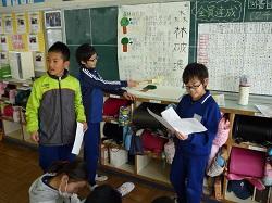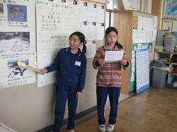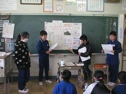 3月9日、5年生は総合的な学習の時間で調べたことを、4年生の前で発表しました。内容は、「地球温暖化」「水質汚染」「森林破壊」「ごみ問題」「大気汚染」「絶滅危惧種」についてです。子どもたちは、グラフや絵をかいたり、劇や紙芝居をしたり、実物を見せたり、巻物にまとめたりと表現の仕方を工夫しながら発表しました。4年生も真剣に聞いていて、質問もたくさんでました。これからどのように生活をしていったらよいか、共に考えることができました。