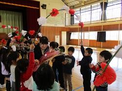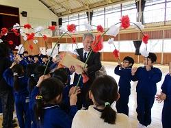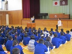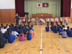 図書ボランティアのみなさんに、お礼の手紙を読み、お花と手紙をお渡ししました。歌のプレゼントでは、感謝の気持ちをこめて、「ありがとうの花」を全校生で合唱しました。