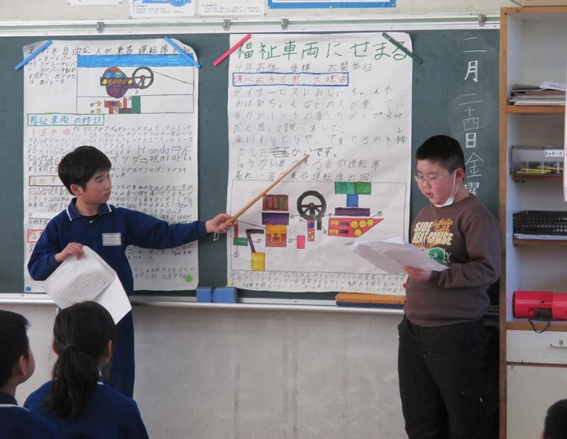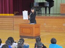 4年生は総合的な学習の時間に福祉について学んできました。2学期に様々な体験学習をし、その後、テーマを決めて調べてきました。はっきりと伝えようとする4年生、目と耳と心で集中して聴く3年生。3年生への復習クイズは、みな大当たり!でした。