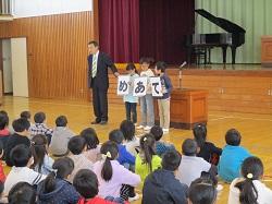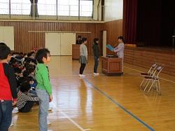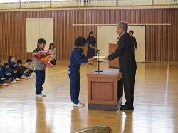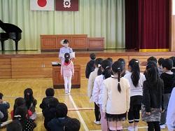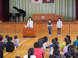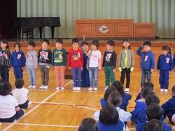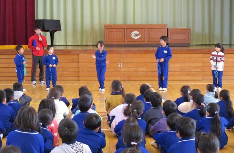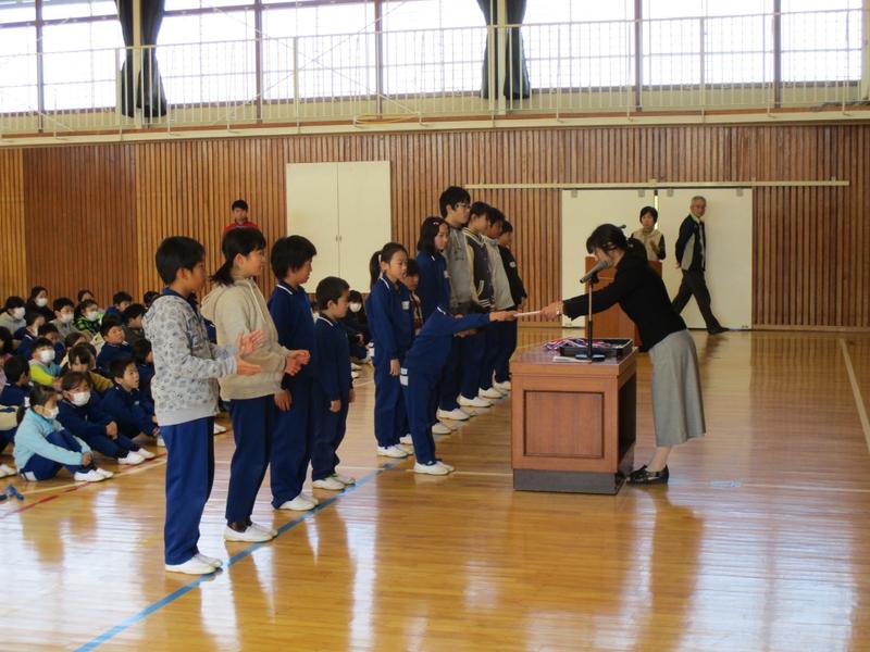 12月から2月にかけて、全校児童が縄跳び検定を頑張ってきました。昨年度よりも級や段が上がった児童が多く見られました。上学年には、超人・鉄人・名人の位を取得した児童もいます。表彰の後、各学年の代表児童が「ハヤブサ」「ツバメ」「側振交差二重」などの得意技を披露し、拍手に包まれていました。