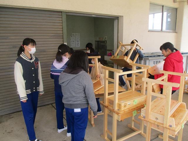 木製のぬくもりのある机とイスです。卒業を控えた6年生が奉仕作業として一階から二階へ全部の机とイスを運んでくれました。今年度もあとわずか、しっかり勉強に取り組みます。