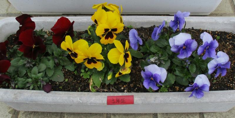 子どもたちの植えたパンジーもきれいに花を咲かせています。