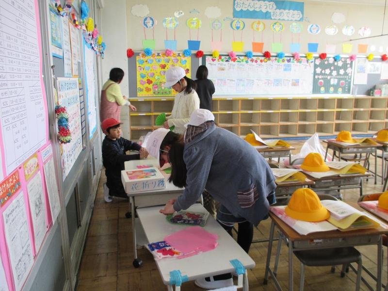 5,6年生と教職員で、入学式場づくり、校舎内外の清掃、1年生教室の準備などを行いました。机の上には、教科書や黄色の通学帽子が用意されました。かわいい22名の1年生、お待ちしています!