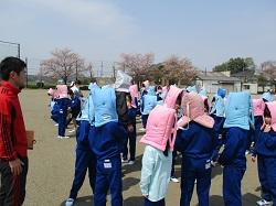 今年度、最初の避難訓練が行われました。火災を想定した訓練だったので防災頭巾をかぶり、