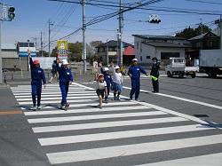 交通指導員の菅谷さん達の指導の下、正しい横断歩道の渡り方や、安全な登校の仕方などを学ぶことが