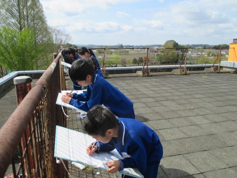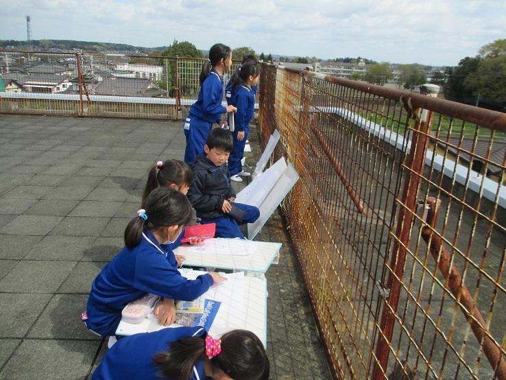 3年生は、社会科で方位の勉強をして屋上から、学校の周りにある建物を調べました。