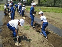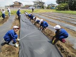 慣れ、上手にマルチをはることができました。来月から、各学年でさつまいもや、きゅうり、