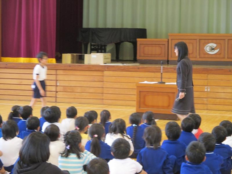 体育館で、新一年生との対面式が行われました。一年生たちは緊張しながらも自分の名前を大きな声で、言うことができました。その後、学級員任命式が行われ、。3、4、5、6年生の新しい学級委員に任命書が手渡されました。