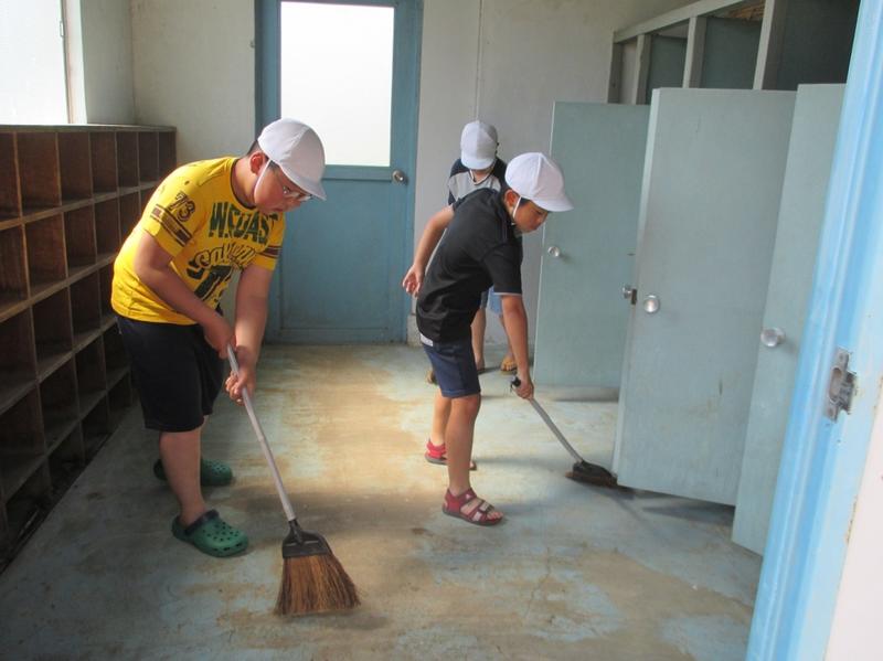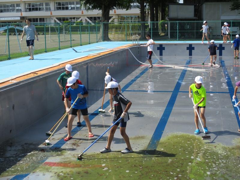 4・5・6年生がプール清掃を行いました。底に積もった落ち葉を取り除き、ブラシで磨きました。子供たちは、6月7日のプール開きを心待ちにしています。