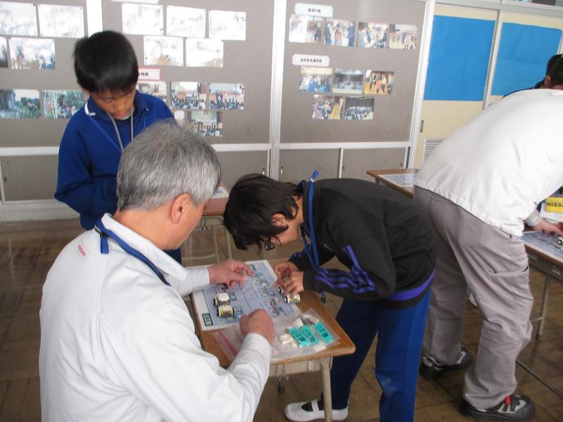 日産ものづくりキャラバンの方に授業をしていただきました。子どもたちはブロックで自動車を組み立てる工程で「改善」と「チームワーク」の大切さを学びました。また、ボルト締付や定量つかみ取りなどモノづくりに関わる体験をし、「安全の大切さ」「ルールを守る大切さ」を学びました。