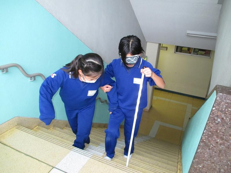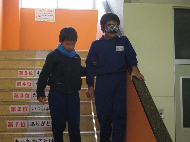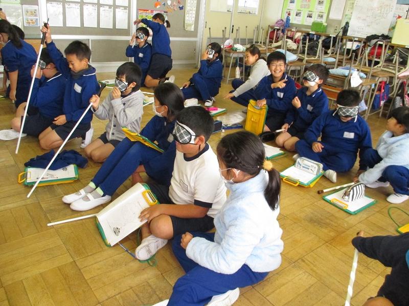 4年生は総合的な学習の時間に福祉をテーマに学習しています。社会福祉協議会の方に数回にわたりご指導いただきました。今回は、アイマスク体験を行いました。児童からは「アイマスクをして歩くのは怖かった。」「具体的な指示をするのが難しかった。」「二人の信頼関係が大切。」などの振り返りがありました。社会福祉協議会の方から、「相手を気遣っている様子が伝わってきてすばらしかった。」とお褒めの言葉をいただきました。