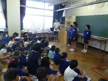 プールサイドで行う予定だったプール開きは雨のため、多目的ルームで行われました。代表の児童が、今年の水泳の目標を発表したり、プール活動での注意事項を確認したりしました。