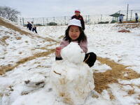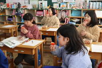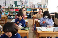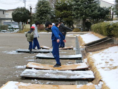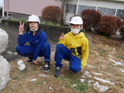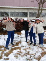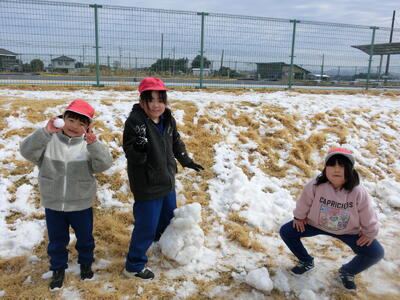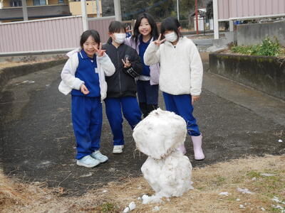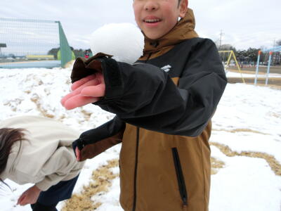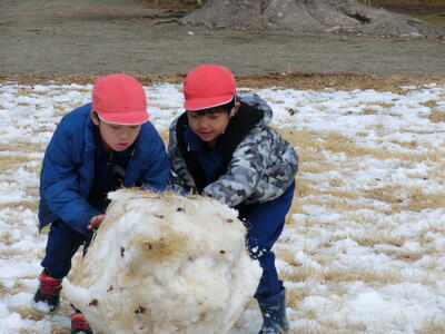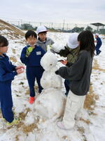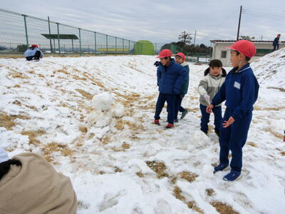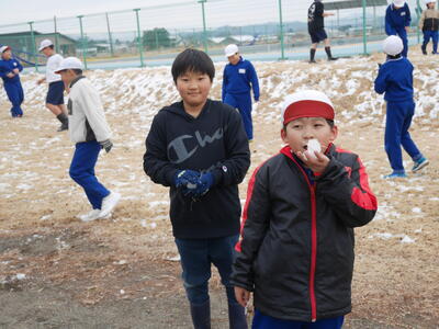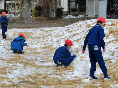 雪が降って、児童たちは大喜び。2時間目の後の長い休み時間に、児童たちは元気に昨日降った雪で遊んでいました。