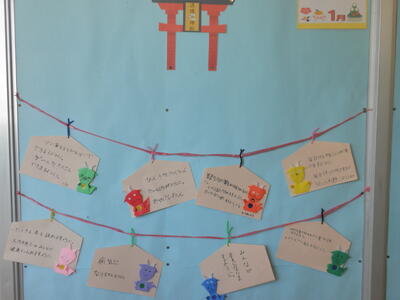 廊下には子どもたちの冬休みの作品が掲示されました。
