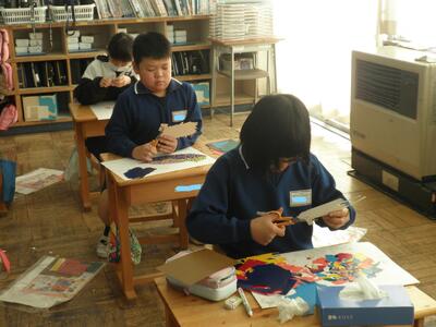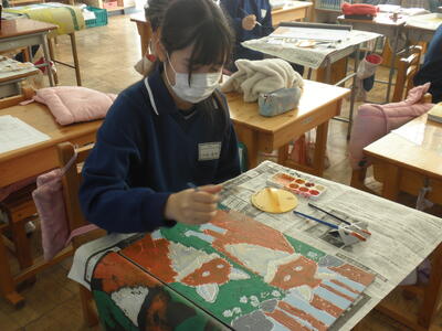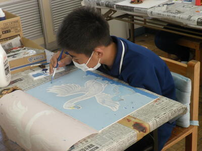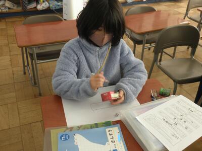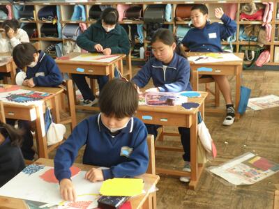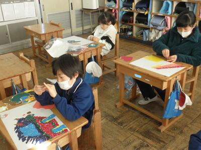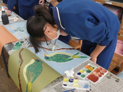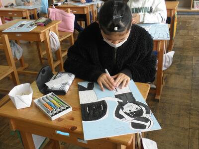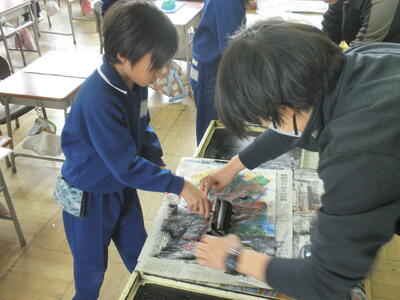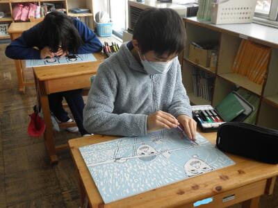 2年生は図工の時間で版画の仕上げをしていました。