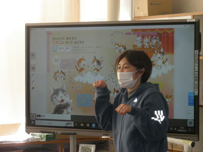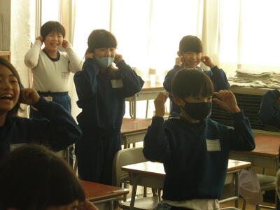 1年生は音楽の授業で、教材名は「おんがくにあわせてこねこになっておどろう」です。