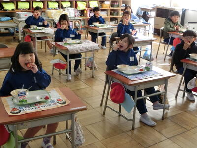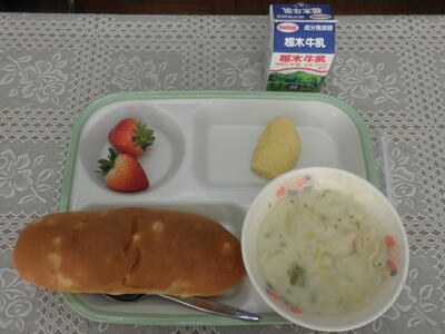今日の給食では、JAはが野からいただいたいちごが2個ずつ配られました。