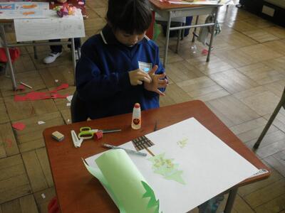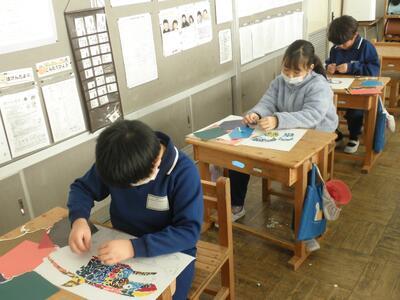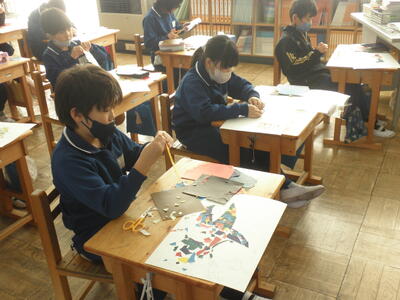 ちぎったりハサミで切ったりした色画用紙を絵に貼りつけ、デザイン画の制作です。