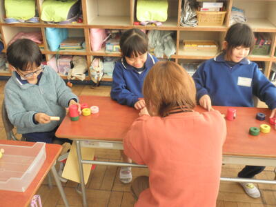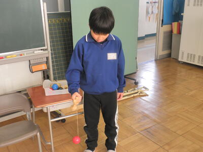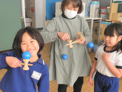 今日は4名のボランティアの方に来ていただき、お手玉やけん玉、だるまおとしやコマ、あやとりなどの遊び方を教えてもらいました。