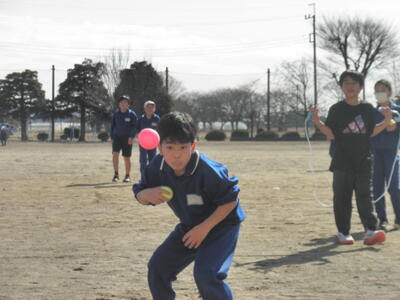 昼休み、縄跳びやキャッチボールをして遊ぶ子どもたち。