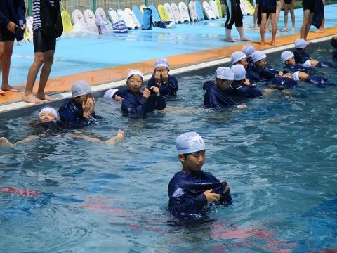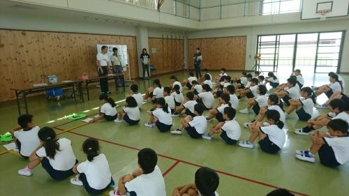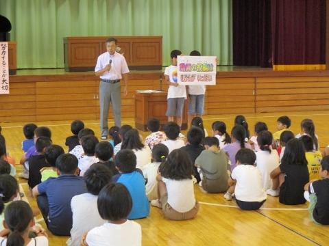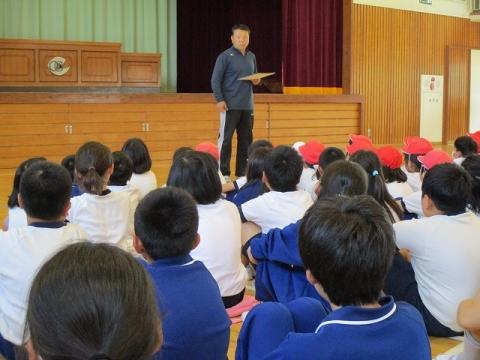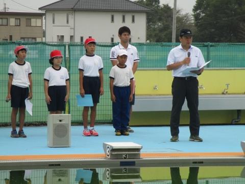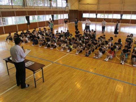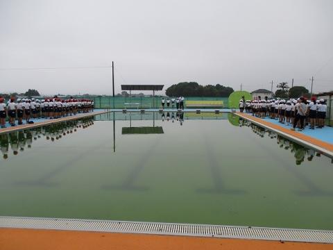 業間の時間にプール開きが行われました。全身運動でもある水泳の学習がいよいよ始まります。全校生で安全に活動できるようにお願いし、児童を代表して6年の森田さんが今年の目標を発表してくれました。校長先生や岡先生から心構えや注意事項を聞き、全員が積極的に活動する事をちかいました。