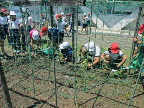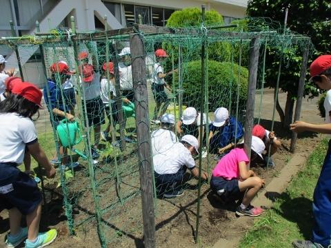 4年生が学校花壇にひょうたんの種とヘチマの苗を植えました。大きく育って欲しいです。