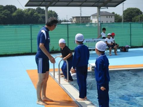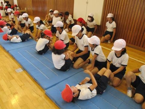 6月11日から体育の時間にプール活動が始まります。万が一のときに備えて、先生方と保護者の希望者が心肺蘇生法の講習を受けました。真岡消防署の救急隊と消防隊の方々から心臓マッサージ、AEDの使い方について指導を受けました。