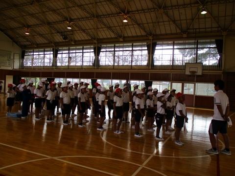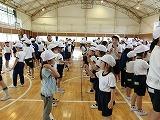 業間の時間には全校生で開会式や、閉会式の練習をしています。学年で、低・中・高学年に分かれて、また、上学年・下学年に分かれて練習しています。