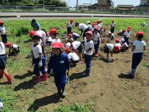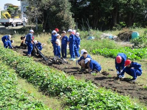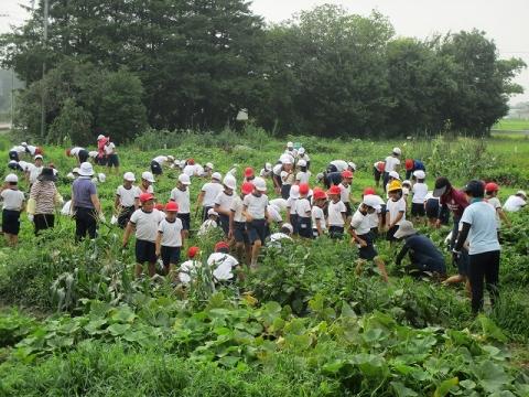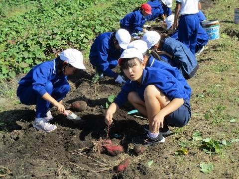 5年生が学校の先頭を切って、さつまの収穫に望みました。今年は、茎や葉はあまり伸びなかったので、どのくらい収穫できるのか心配をしていましたが、とても大きな芋を収穫することができました。
