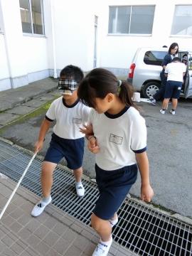 4年生が「総合的な学習の時間」の学年テーマ「ふれあいの和を広げよう」(福祉)で、アイマスク体験をしました。だれもが笑顔で生活できるために、様々な問題点を見つけ、改善に向け考えています。