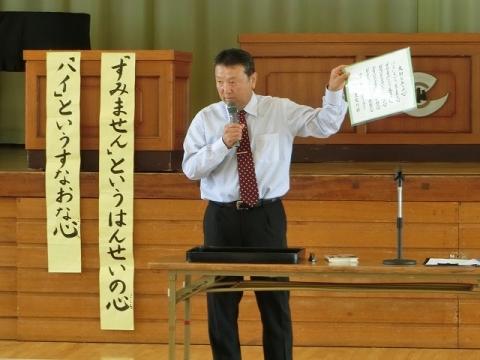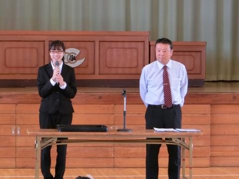 今日から約1ヶ月間、教育実習生として本校卒業生の納城さんが紹介されました。また、校長先生から「すみません」という反省の心、「ハイ」という素直な心についてお話しをいただきました。