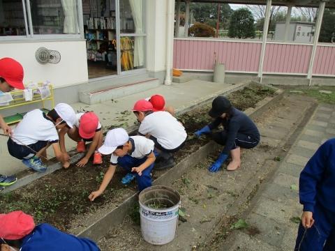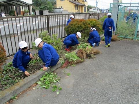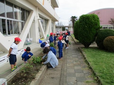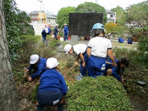業間の時間にクリーン作戦をしました。1・2年生は学級の花壇を、3年生は学校農園を、4・5年年生は北側フェンスわきの草取り、6年生は落葉はきをしました。