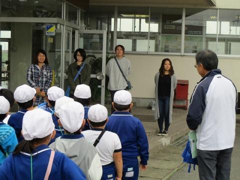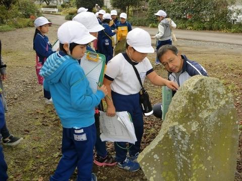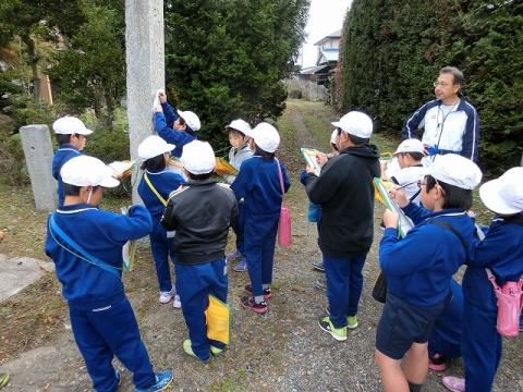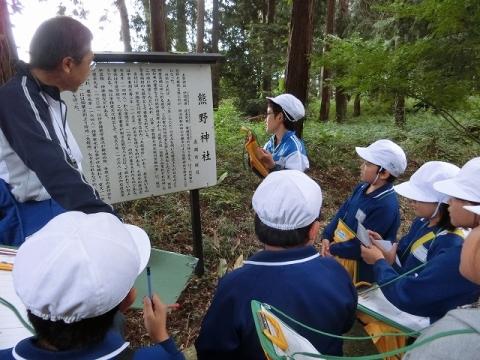 付添ボランティア4名の皆さんの協力を得て、3年生が社会科見学をしました。道路脇にある石碑の文字を確認したり、熊野神社について調べ学習をしました。