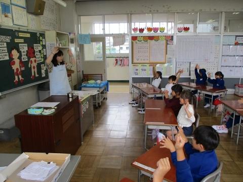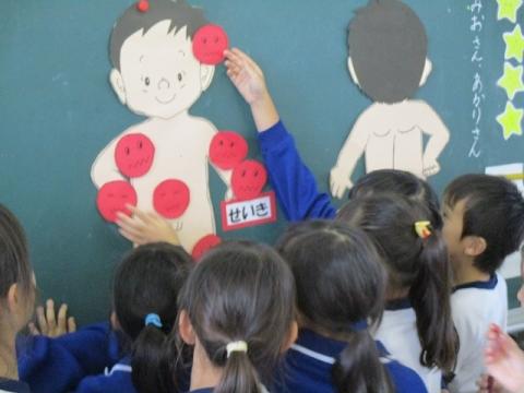 「からだをきれいに」と題して1年生が勉強しました。「よどれはどこから?」の問いに外からや内側からもあることに気づきました。正しい手の洗い方やお風呂の入り方についても勉強しました。
