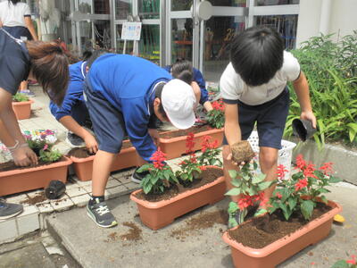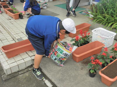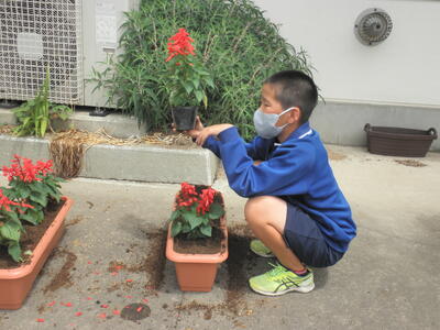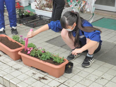 業間の時間は、環境委員会の児童たちが人権の花をプランターに植え替えてくれました。