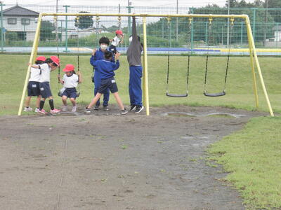 ブランコの下には大きな水溜まりがありますが、全く気にならない様子ですね・・・。