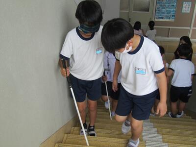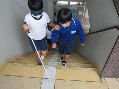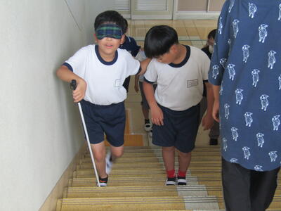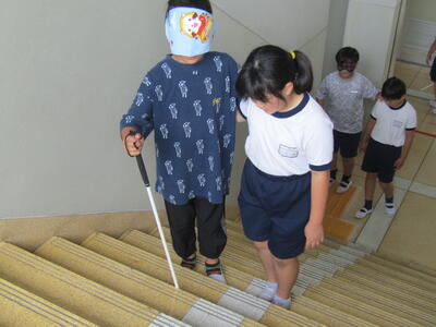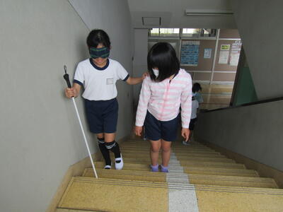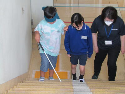 担当の方から説明を受けた後、児童は二人組になって目隠しをし、階段の昇り降りを体験しました。