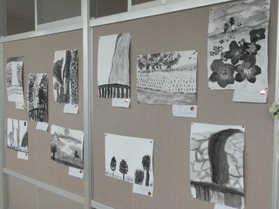 3年生は題材名「み近なしぜんの形・色」の授業で、画用紙に絵の具で様々な緑色をつくっていました。