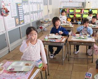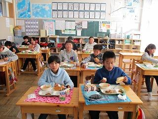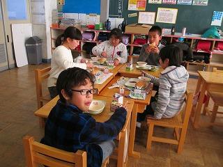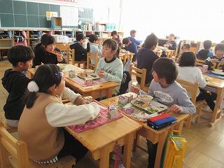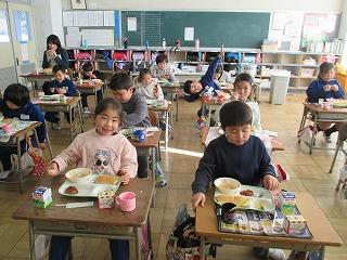 ツリー型のハンバーグ、☆方のチーズ入りサラダ、雪だるまのはんぺんの入ったスープなど、かわいらしいメニューに喜んでいました。今学期も毎日おいしい給食がいただけたことに感謝!明日からは、家庭料理を味わってください。