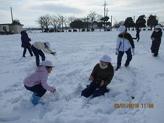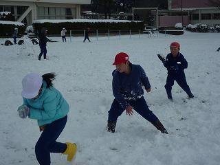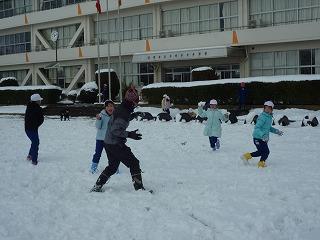 広い校庭いっぱいに子供達が遊んでいました。先生と子供が一緒になって、雪合戦、雪だるま作りなどを楽しみました。歓声と笑い声が響いていました。