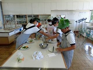 5年生が家庭科の「野菜をゆでておいしく食べよう」の学習で調理実習を行いました。各班で計画を立てて、ゆで野菜サラダを作りました。友達と協力しながら、おいしいゆで野菜サラダを作ることができました。